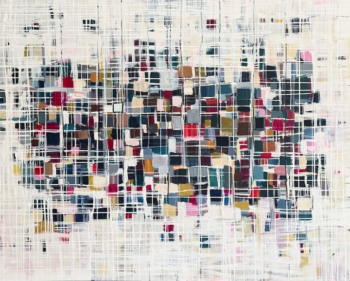 Her compositions, which she calls “grids of the earth”, are inspired by aerial views from airplanes, combining elements of cityscapes, landscapes, and abstract mapping. “I want to take people beyond what they see every day—to a new world where colors, lines, and forms interact in ways they never expected.”