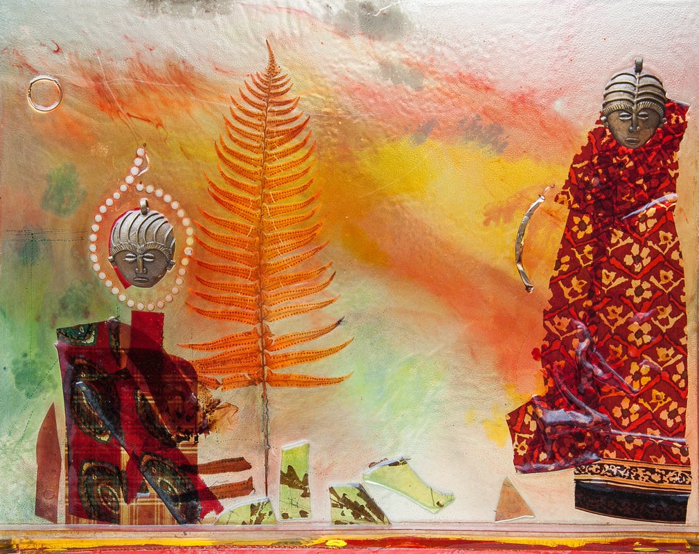 Washington’s process was exacting and physically demanding. He poured thin layers of plastic resin into molds, often five or six layers deep, beginning with lighter colors and building toward darker hues. Into these layers he embedded objects, African gold weights, semi-precious stones, small drawings, fragments that carried their own histories. Each layer had to cure before the next could be poured. Once complete, the surface was sanded and polished with extreme care.